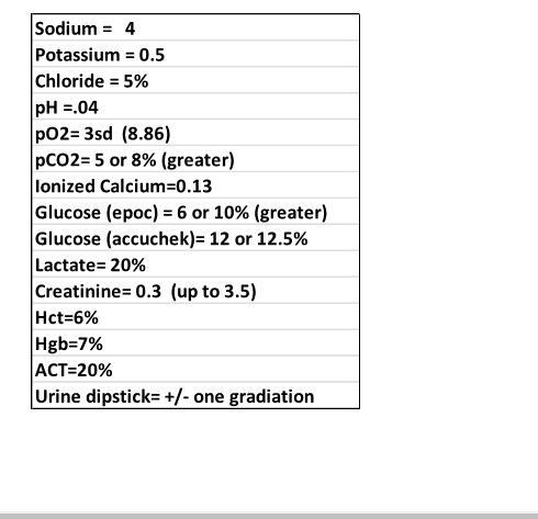 Just want to ask you all what your acceptability criteria for your Method Comparison between your Main Lab and the EPOC. Do you specifically use what you got when you did your initial validation or something else. I specifically want to know about Sodium. Ours is +/- 4 mmol/L. I know that CAP uses that same criteria for our PT. Is that what everybody is using too? Every time I do my method comparison I have a couple of patients that are outside of acceptability. It's usually between +/- 4.5 - 6. We just started the EPOC last year so I only have a couple of comparisons performed since then.