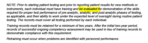 So I know that to assess competency for a moderately complex testing you must meet the classification for a technical consultant. If you are only training staff and not assessing competency is there any personnel requirement? Also, if you have a non- 4 year person training (with laboratory experience) but not a technical consultant will assessing competency at the 6 month mark be sufficient?