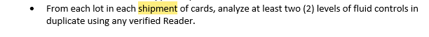 The procedure (directly from the operator's manual) says: "From each lot in each shipment of cards, analyze at least two (2) levels of aqueous controls using one reader."