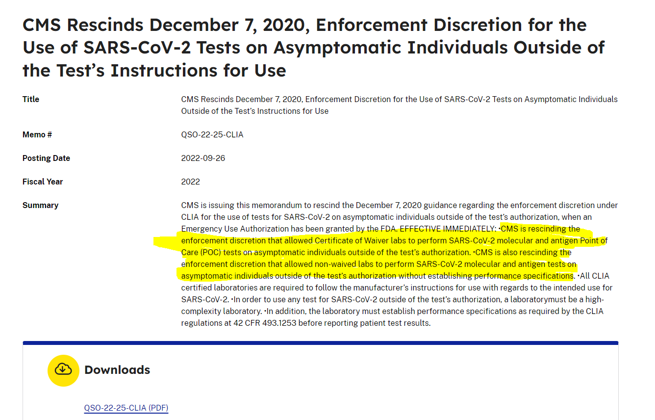 This looks like it includes all molecular and antigen testing for Covid on asymptomatic patients, waived or non-waived.  Am I reading that correctly?  If so this could pose an issue for our entire lab, not just POC