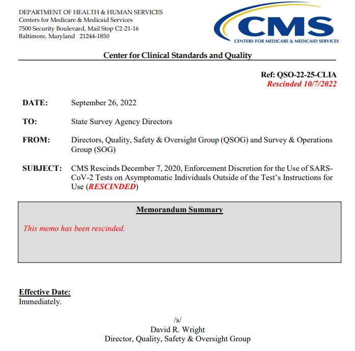 CMS communication for waived Covid testing devices